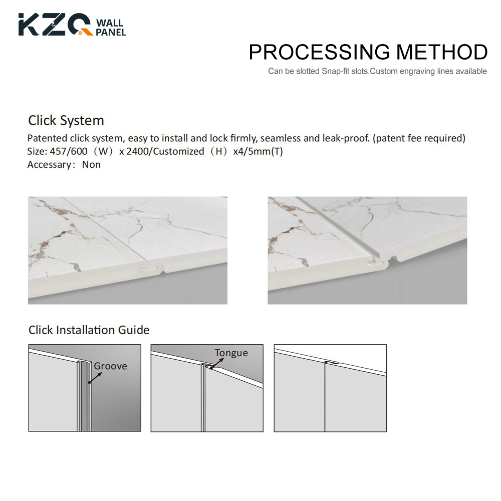 SPC 벽 패널은 4mm 및 5mm 두께로 제공되어 다양한 설치 요구에 적합합니다. Unilin Lock 설치 시스템으로 설치가 간편하여 시간과 노력을 절약할 수 있습니다. SPC 벽 패널 타일의 클릭 스톤 디자인은 벽에 DIY 설치하기 편리하며 바닥재로도 사용할 수 있습니다.